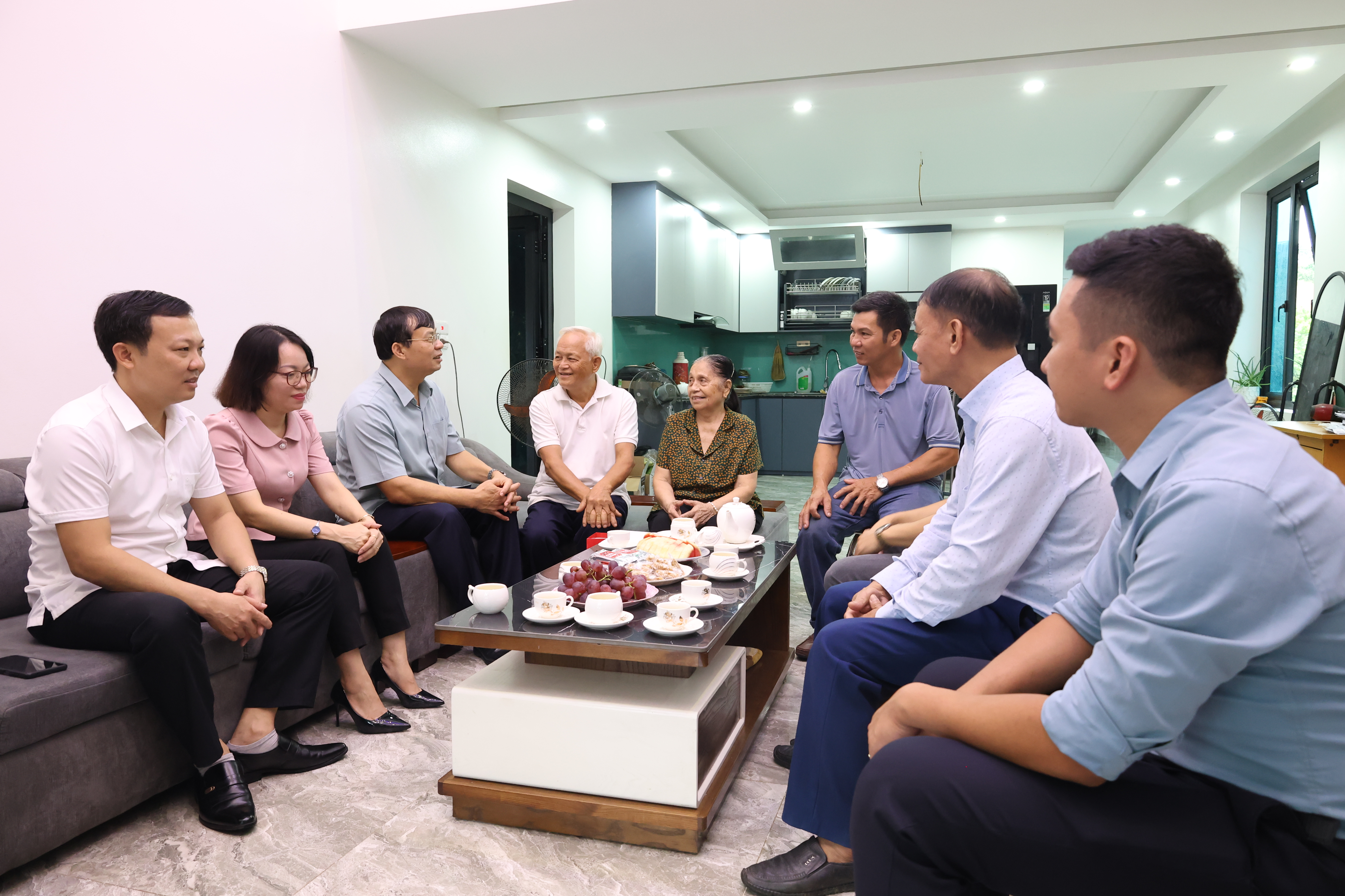 Đồng chí Bí thư Đảng ủy xã Yên Sơn hỏi thăm tình hình sức khỏe ông Hà Tuấn Phủ, người cao tuổi thôn Đồng Cầu cùng gia đình.